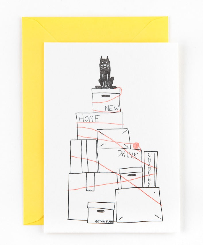 Ansichtkaart / Wenskaart verhuizing - nieuw huis - moving the cat met envelop. Gedrukt met een Heidelberg drukpers - handgemaakt... Lees meer