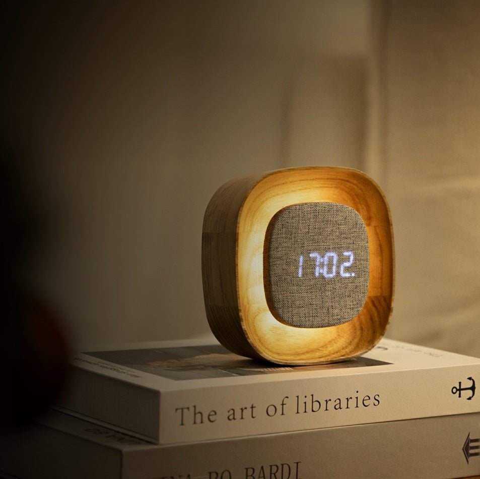 Gingko Design Lumos wekker in essen hout met achtergrond verlichting. Stel je voor dat je wakker wordt met de elegante aanwezigheid van de Lumos Clock , een designhorloge dat functionaliteit combineert met kalme, natuurlijke schoonheid. Met de drie instelbare lichtniveaus – geactiveerd met een simpele tik – begin je de dag met zacht, sfeervol licht dat de ochtendgloed nabootst. (Let op: het licht wordt niet automatisch geactiveerd met de wekker, maar kan handmatig worden ingeschakeld voor een rustige start.)