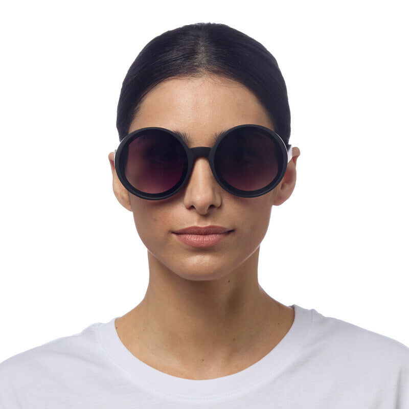 Okkia Monica Round dames zonnebril in zwart. Vintage en modern! Alleen zij kunnen zo zijn. XXL montuur, soft touch, gradiënt... Lees meer