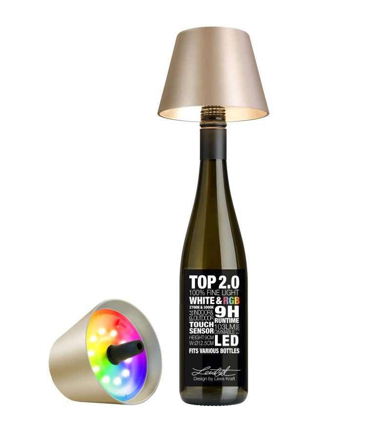 Sompex Top 2.0 flessenlamp led met accu in kleur champagne. De Top 2.0 lamp maakt van elke wijnfles, olijfoliefles of bv kruik een fraaie tafellamp. De lamp kan ingesteld worden op kouder en warmer wit licht en een aantal andere lichtkleuren. Bewaar je een champagnefles als herinnering aan een mijlpaalverjaardag of een simpele bierfles omdat deze is geleegd op een onvergetelijk feest? Dit oude glas kan nu een heel bijzonder lichtobject worden - met de TOP-decoratielamp van Sompex! Dankzij de conische vorm past de siliconen stop in de meest uiteenlopende flessenhals - zo tovert u in een mum van tijd stijlvolle verlichting met een unieke uitstraling tevoorschijn. De traploos dimbare TOP 2.0 werkt draadloos op ingebouwde accu en kan zowel binnen als buiten voor warm licht zorgen. De TOP 2.0 wordt geleverd in een mooie ronde verpakking, die anders alleen bekend is van fijne flessen - een perfect cadeau. Wordt geleverd zonder fles.