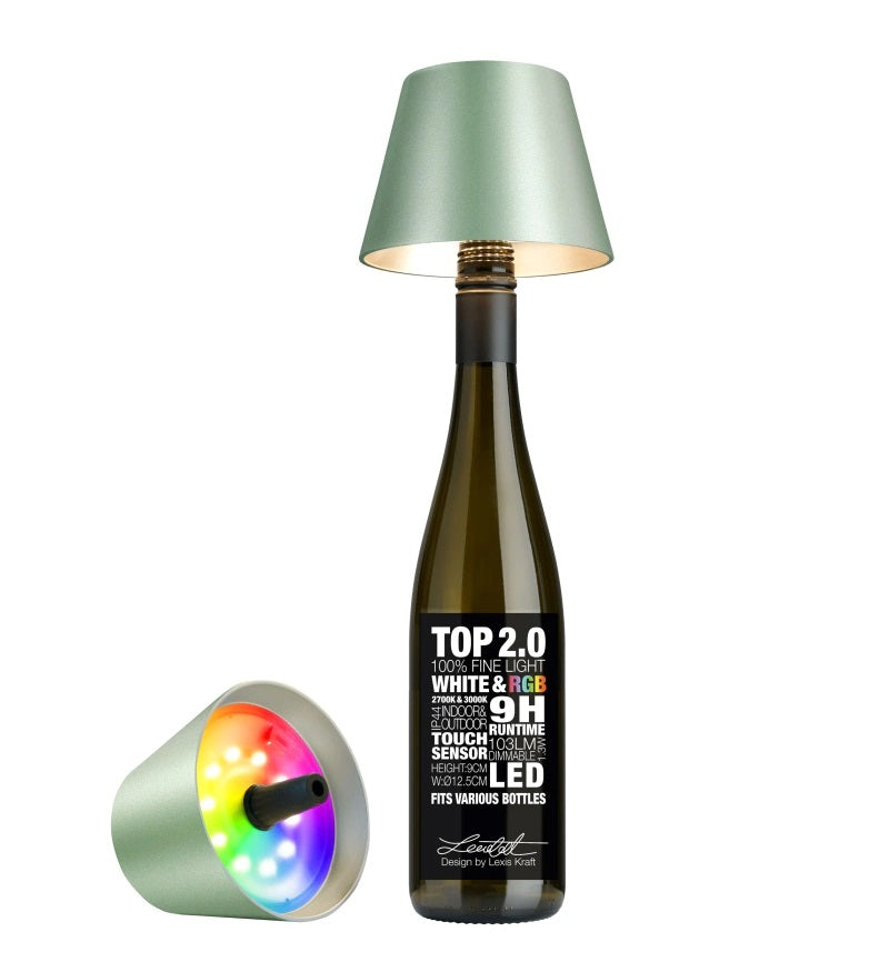 Sompex Top 2.0 flessenlamp led met accu in kleur metallic groen. De Top 2.0 lamp maakt van elke wijnfles, olijfoliefles of bv kruik een fraaie tafellamp. De lamp kan ingesteld worden op kouder en warmer wit licht en een aantal andere lichtkleuren. Bewaar je een champagnefles als herinnering aan een mijlpaalverjaardag of een simpele bierfles omdat deze is geleegd op een onvergetelijk feest? Dit oude glas kan nu een heel bijzonder lichtobject worden - met de TOP-decoratielamp van Sompex! Dankzij de conische vorm past de siliconen stop in de meest uiteenlopende flessenhals - zo tovert u in een mum van tijd stijlvolle verlichting met een unieke uitstraling tevoorschijn. De traploos dimbare TOP 2.0 werkt draadloos op ingebouwde accu en kan zowel binnen als buiten voor warm licht zorgen. De TOP 2.0 wordt geleverd in een mooie ronde verpakking, die anders alleen bekend is van fijne flessen - een perfect cadeau. Wordt geleverd zonder fles.